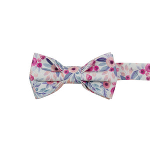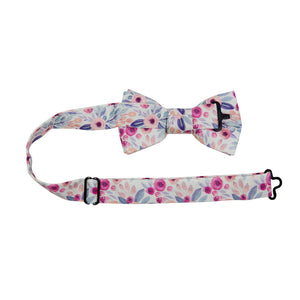 Hermosa Pre-Tied Bow Tie with adjustable neck strap. Cream/off white background with pink and peach circular flowers and blue and green leaves throughout.